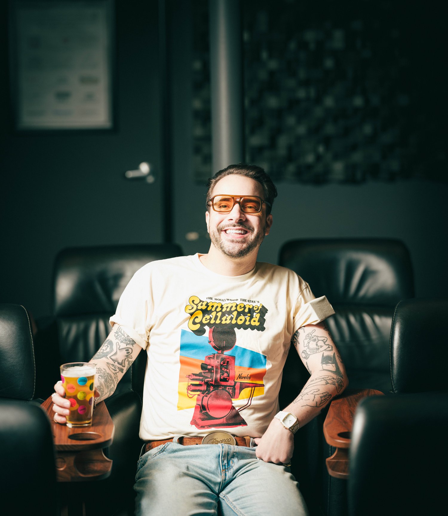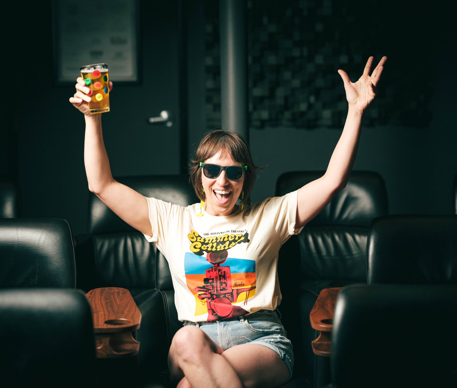 To celebrate our remarkable 2 month long series SUMMER OF CELLULOID, we partnered with local artist Shea Satterlee (@littlesidetable) to design our latest limited edition shirt, which features some of the most iconic characters from our 18 film lineup, as well as a spotlight on the true star of the series, our beautiful Norelco projector!